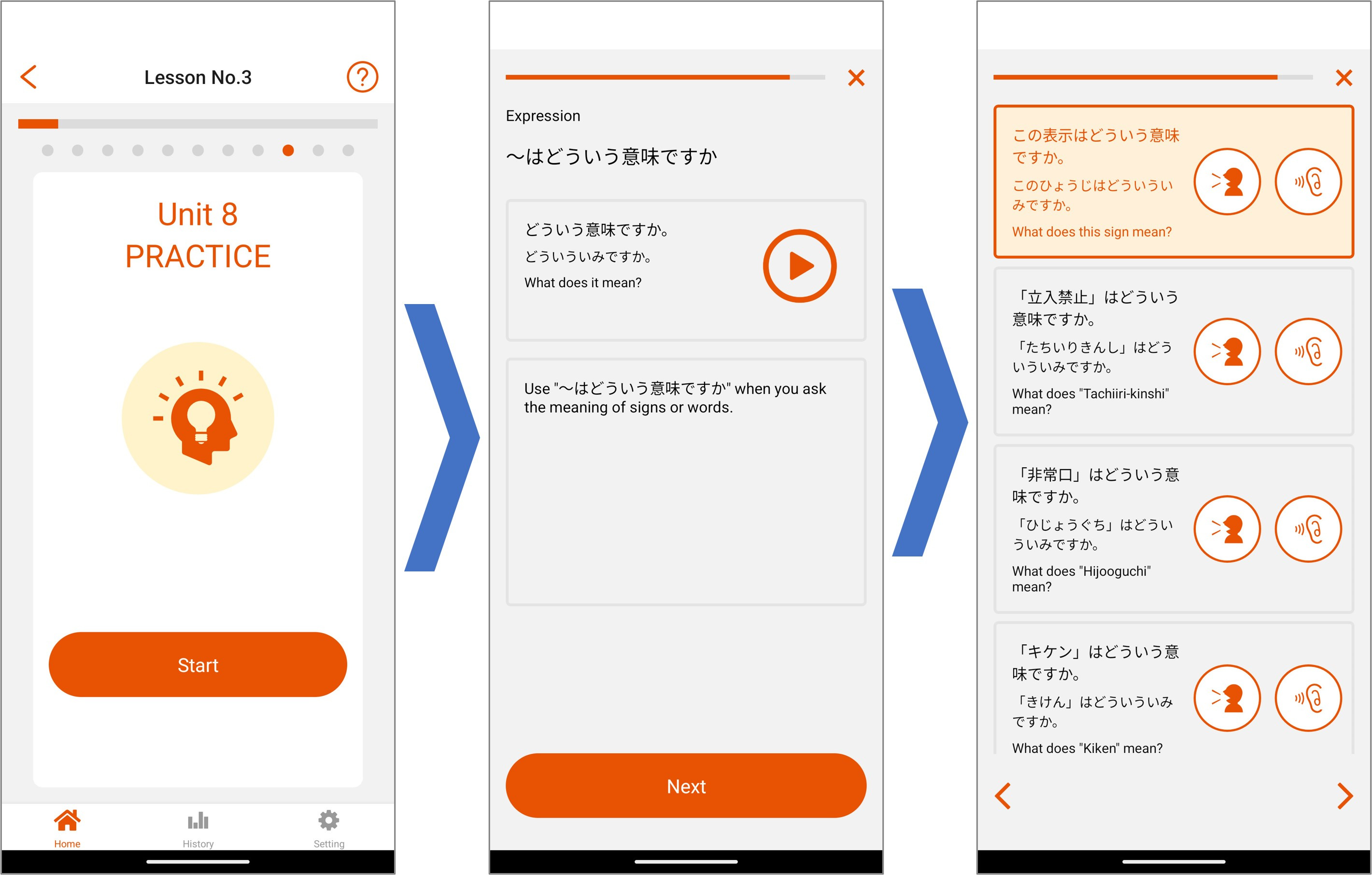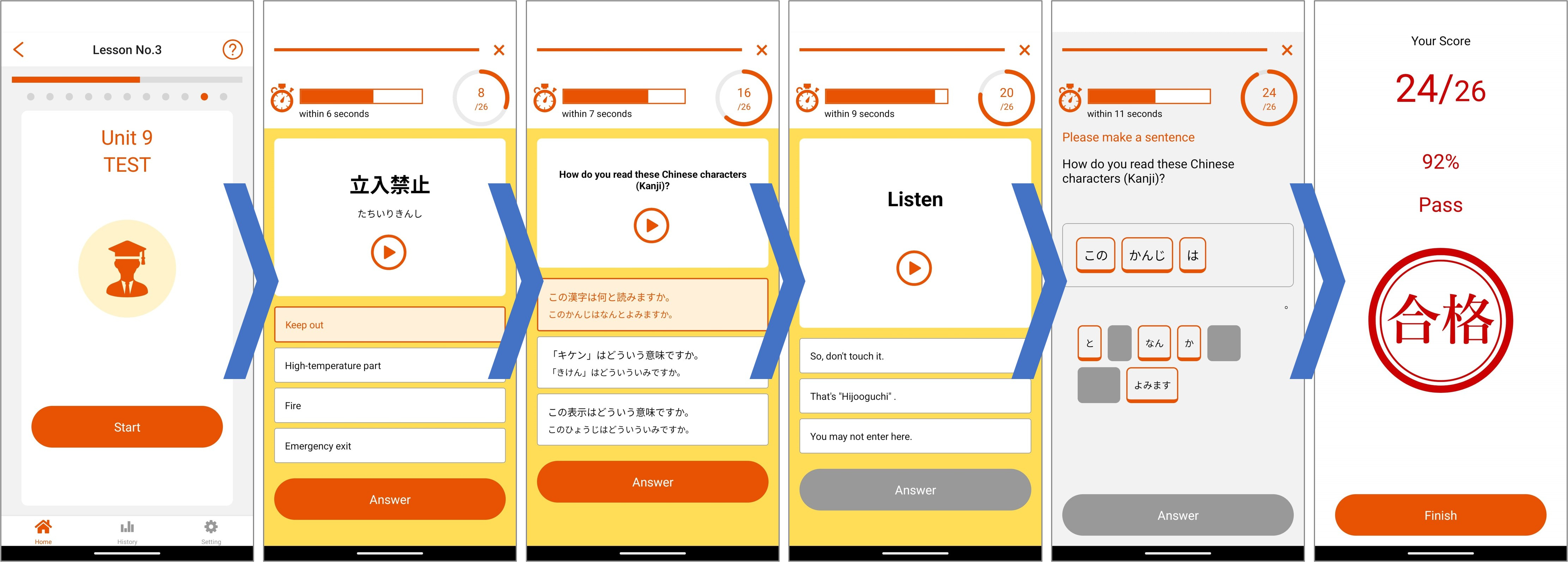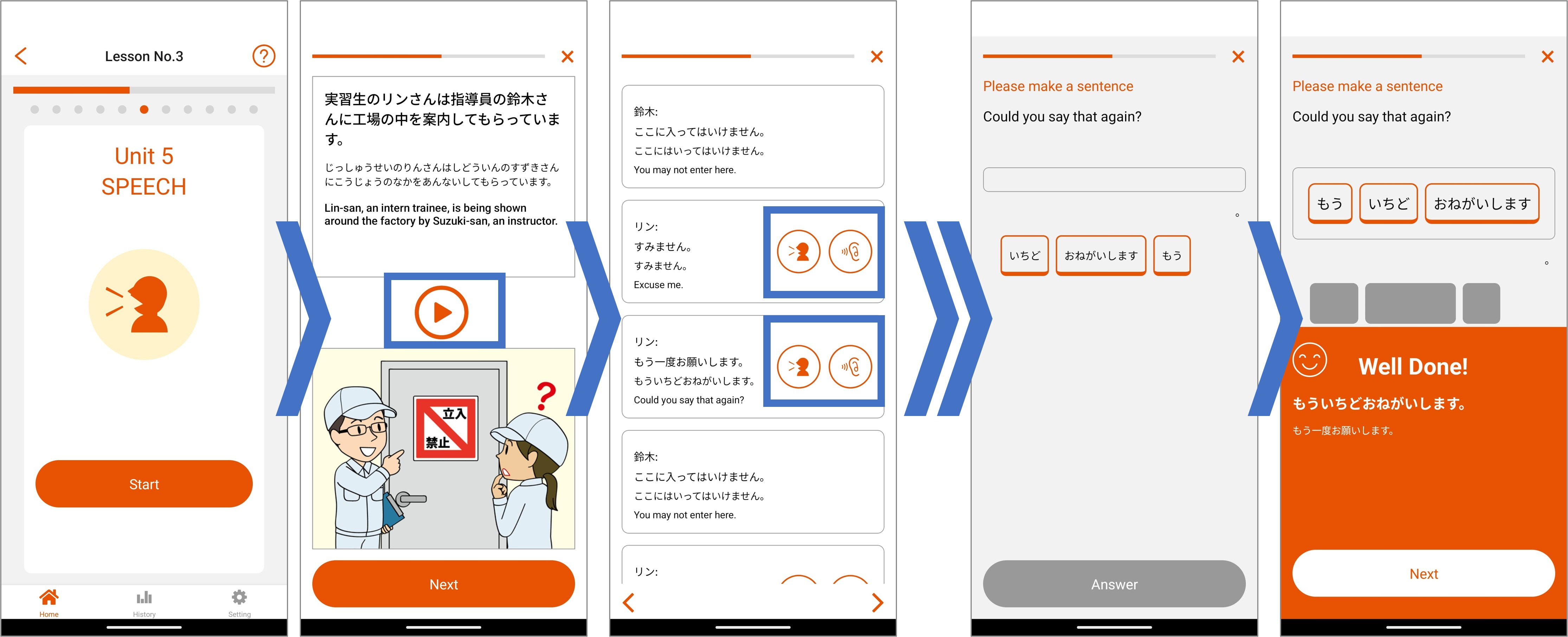 All of the lessons are different, but every lesson has units called CONVERSATION, WORD, SPEECH, PRACTICE, and TEST. The lessons are set so that you start with listening and understanding the conversations, and move on to being able to practice speaking.