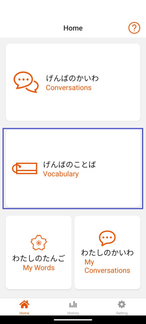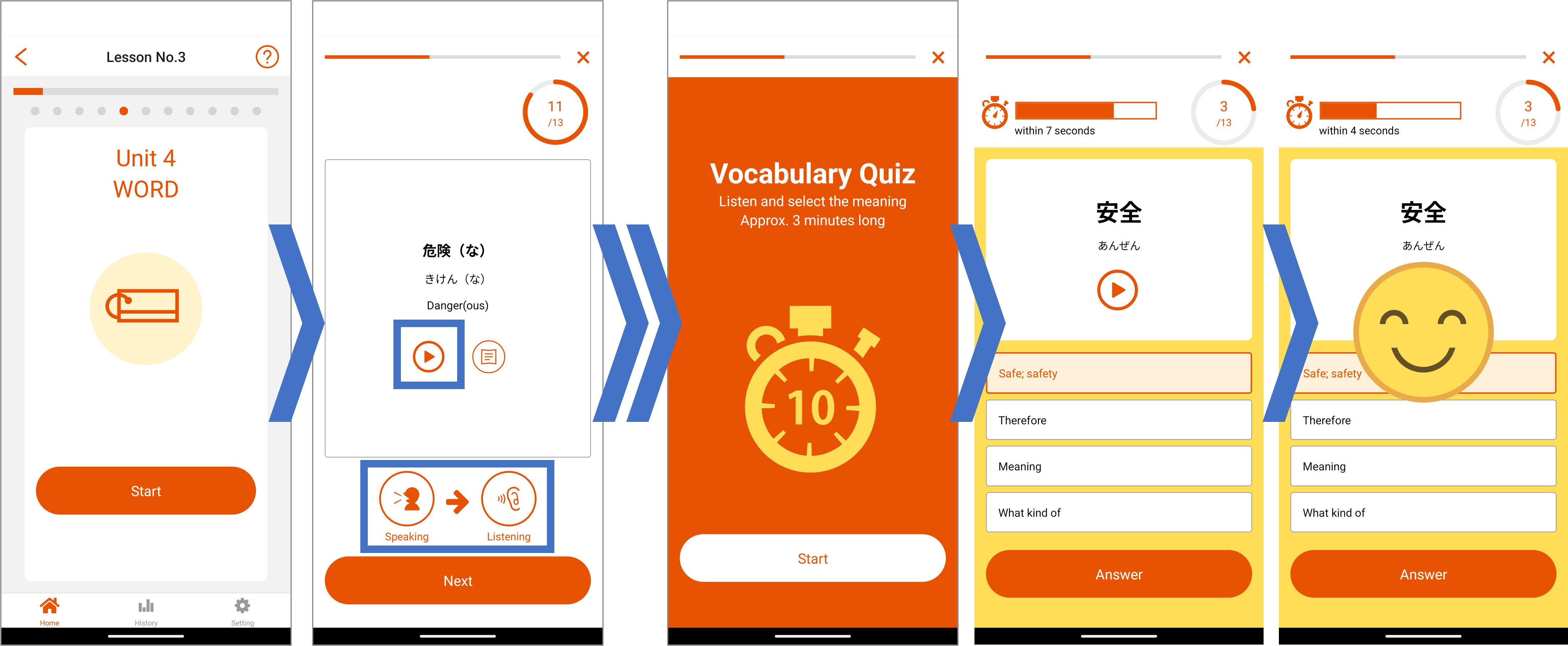3. WORDではことばを学びます。ことばの意味を知るだけでなく、音声を聞いたり、自分の発音を録音して確認したりすることもできます。ことばを学習した後にはクイズもあります。何度もくりかえしできるので、ことばの意味がスムーズに答えられるようになるまで復習しましょう!