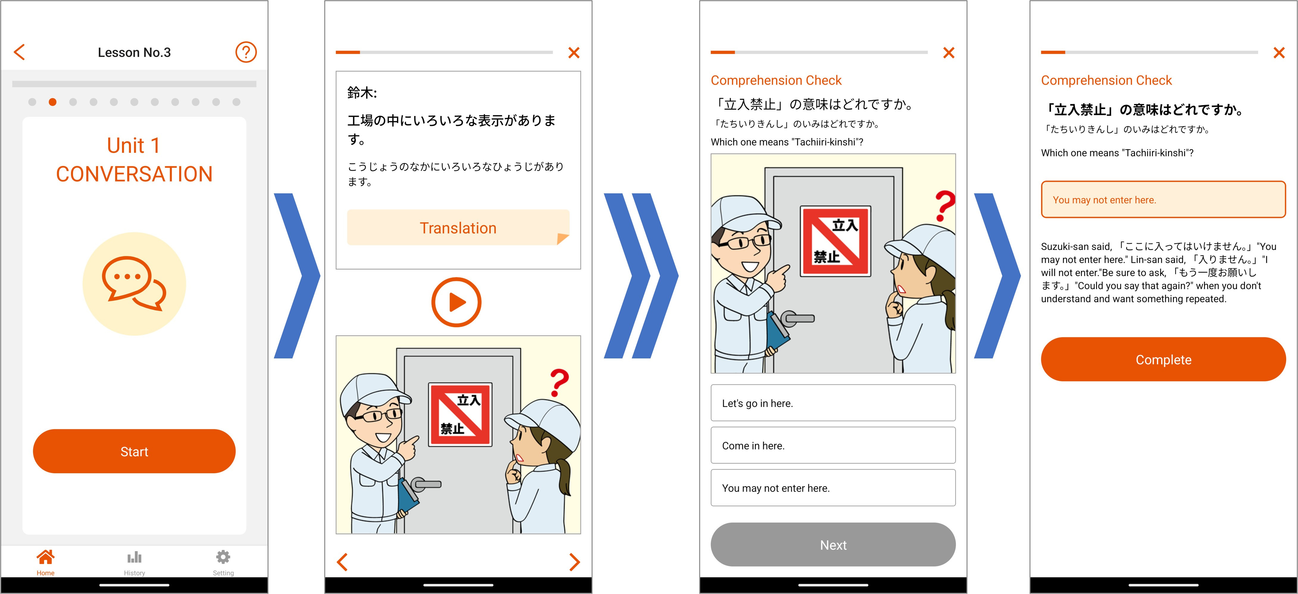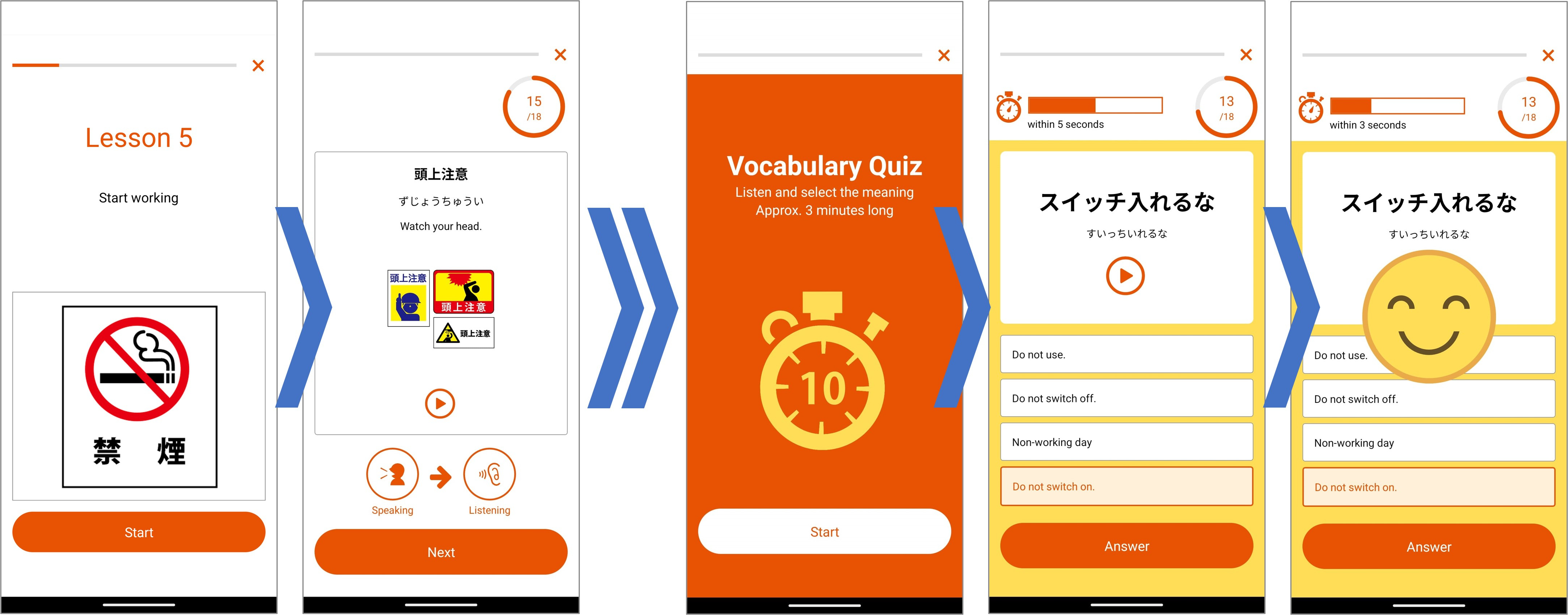 • 「げんばのかいわ」や「げんばのことば」では、仕事の現場で使用される会話を聞いたり話したりして、ことばや表現を学びます。会話の内容や学んだことばや表現を確認するためのクイズもあります。