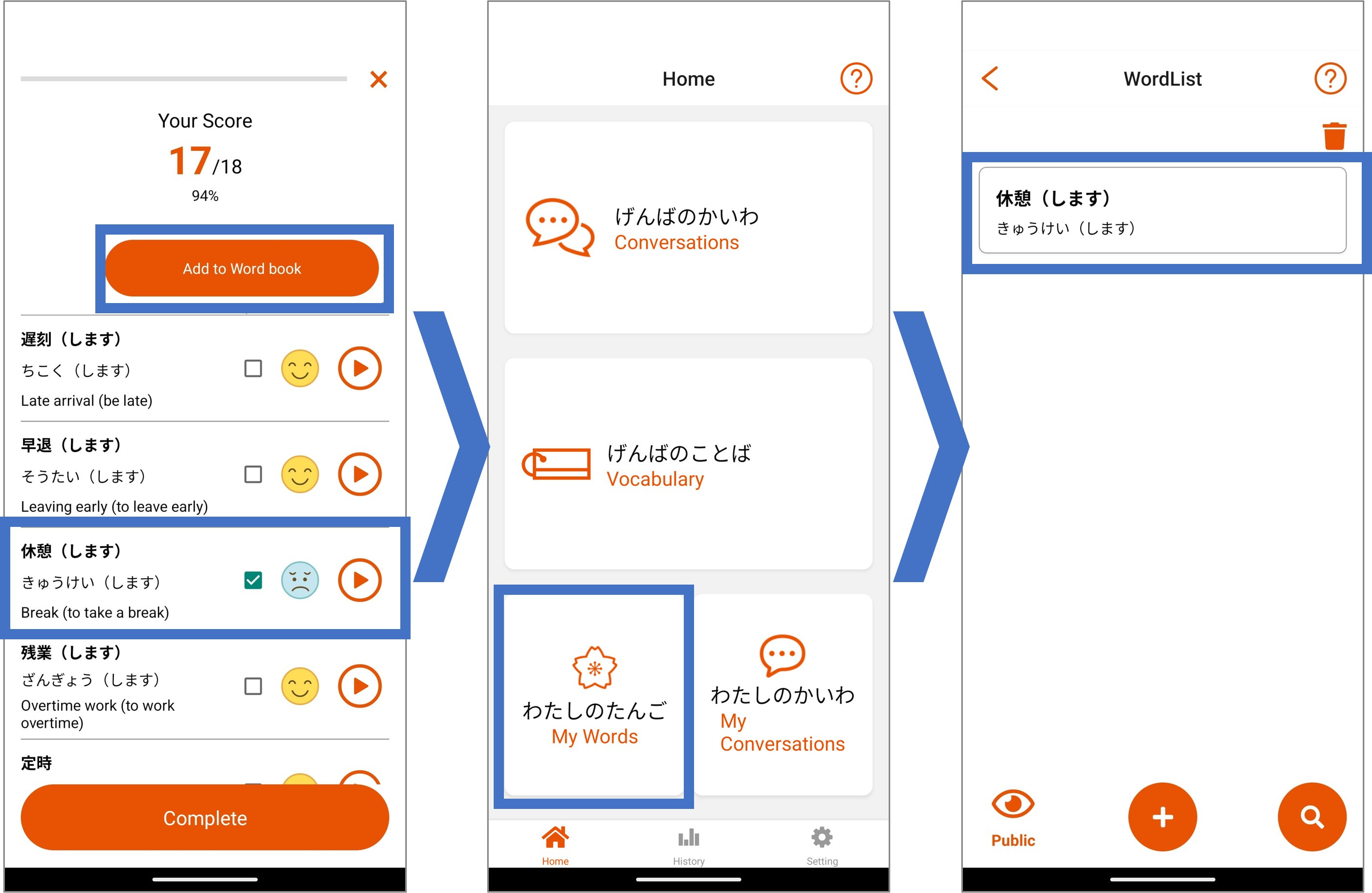 ことばの確認では、意味を見て覚えるだけではなく、発音を聞いたり、自分の発音を録音して確認することができます。難しいことばにはイラストや説明もついているので、一人でも学習しやすいです。