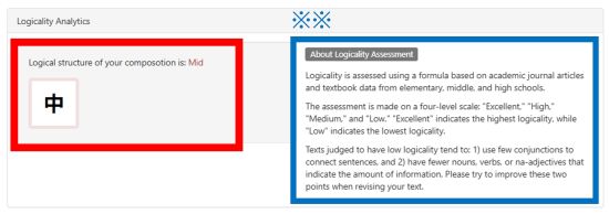 The logicality evaluation (analytics) shows whether your essay is logical. It has four levels: Excellent, High, Medium, and Low.