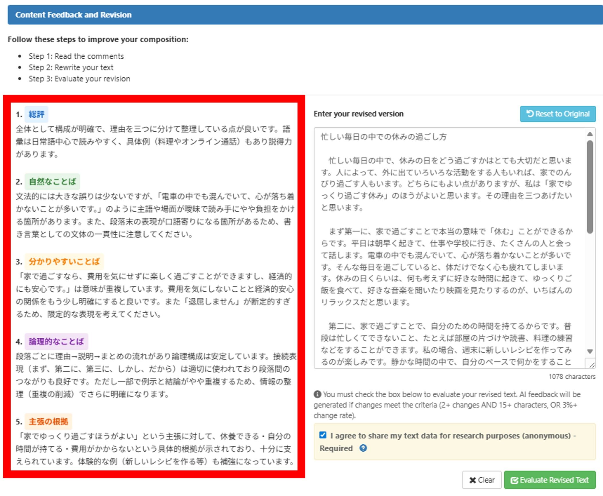 Here, choose from 1. Content Feedback and Revision, 2. Grammar and Vocabulary Feedback, and 3. Essay Comparison.