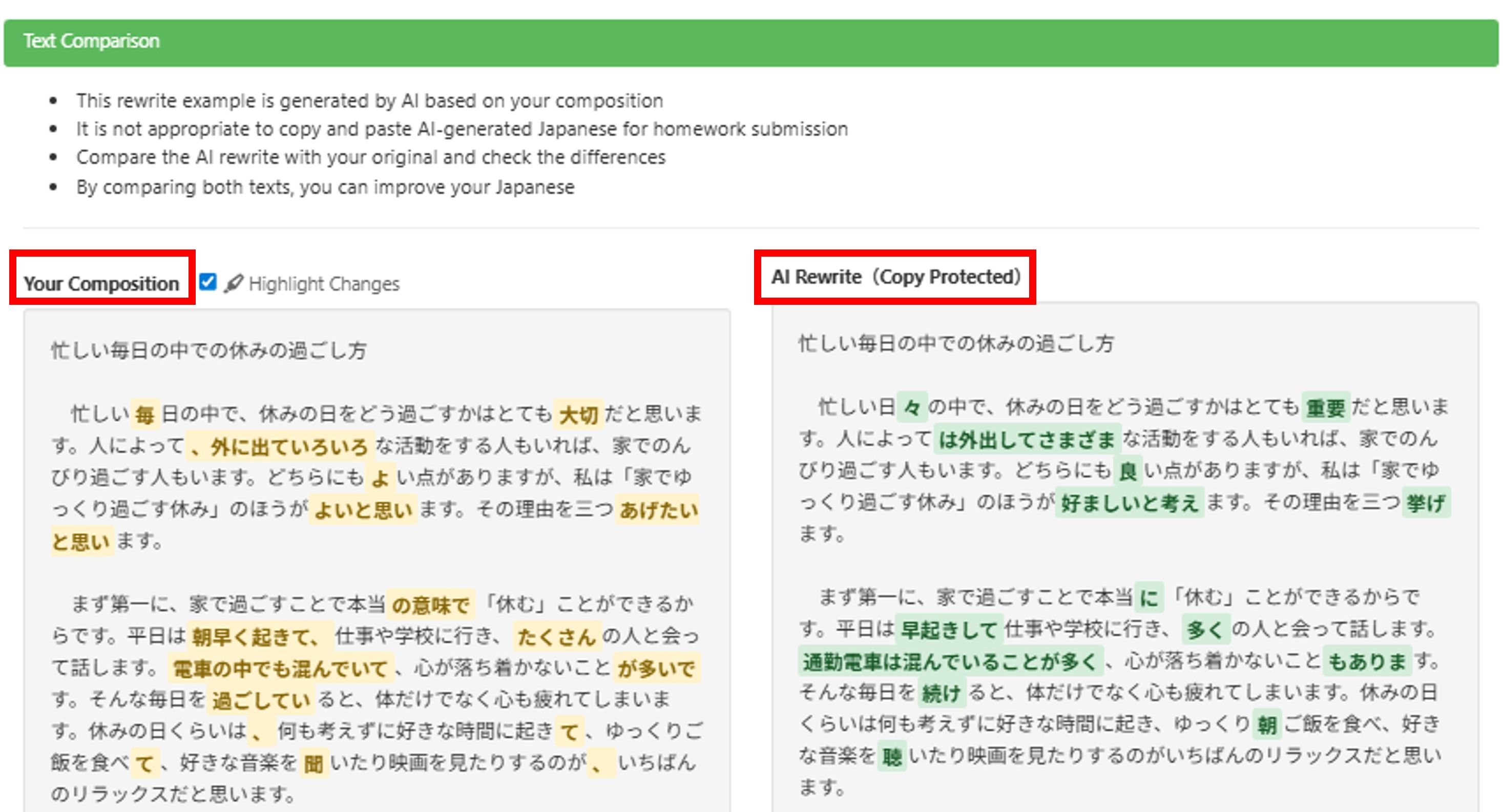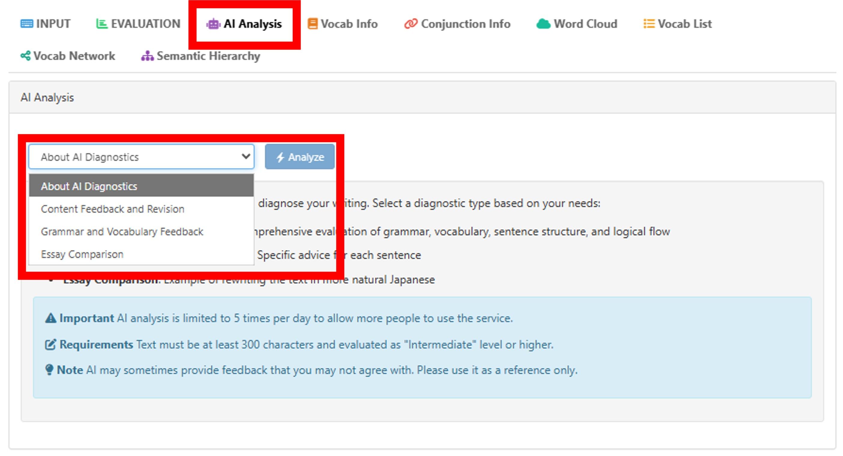 - If your composition level is higher than intermediate, you can use the AI diagnostics. This will be helpful when rewriting your essay because it will give you feedback on your content as well as grammar and vocabulary.