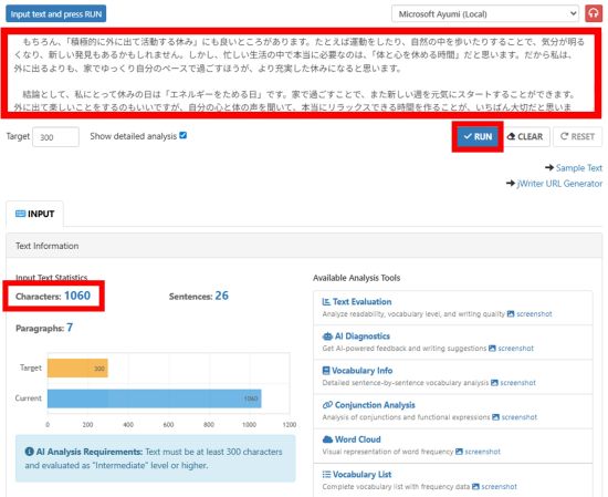 The text you enter should be 300 characters or more. As an example, we entered an essay of roughly 1,000 characters.