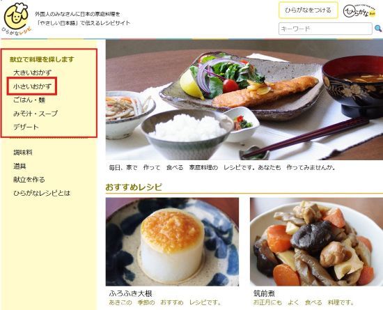 - You'll find recipes under 大きいおかず (main dishes), 小さいおかず (side dishes), ごはん・麺 (rice and noodles), みそ汁・スープ (miso soup and other soup), and デザート (desserts). You can also see examples of complete meals.
