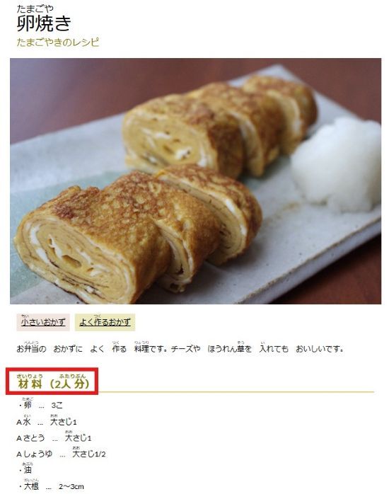 We want to know about regularly served dishes, so let's find a recipe from 小さいおかず (side dishes).