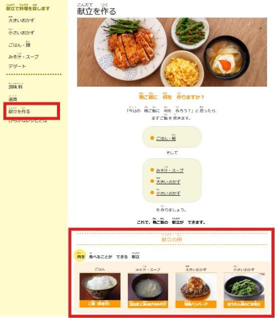 You can find full meal examples under 献立を作る (create a menu).