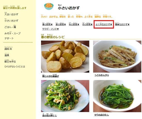 Let's click よく作るおかず (frequently made side dishes) and see what we can find.
