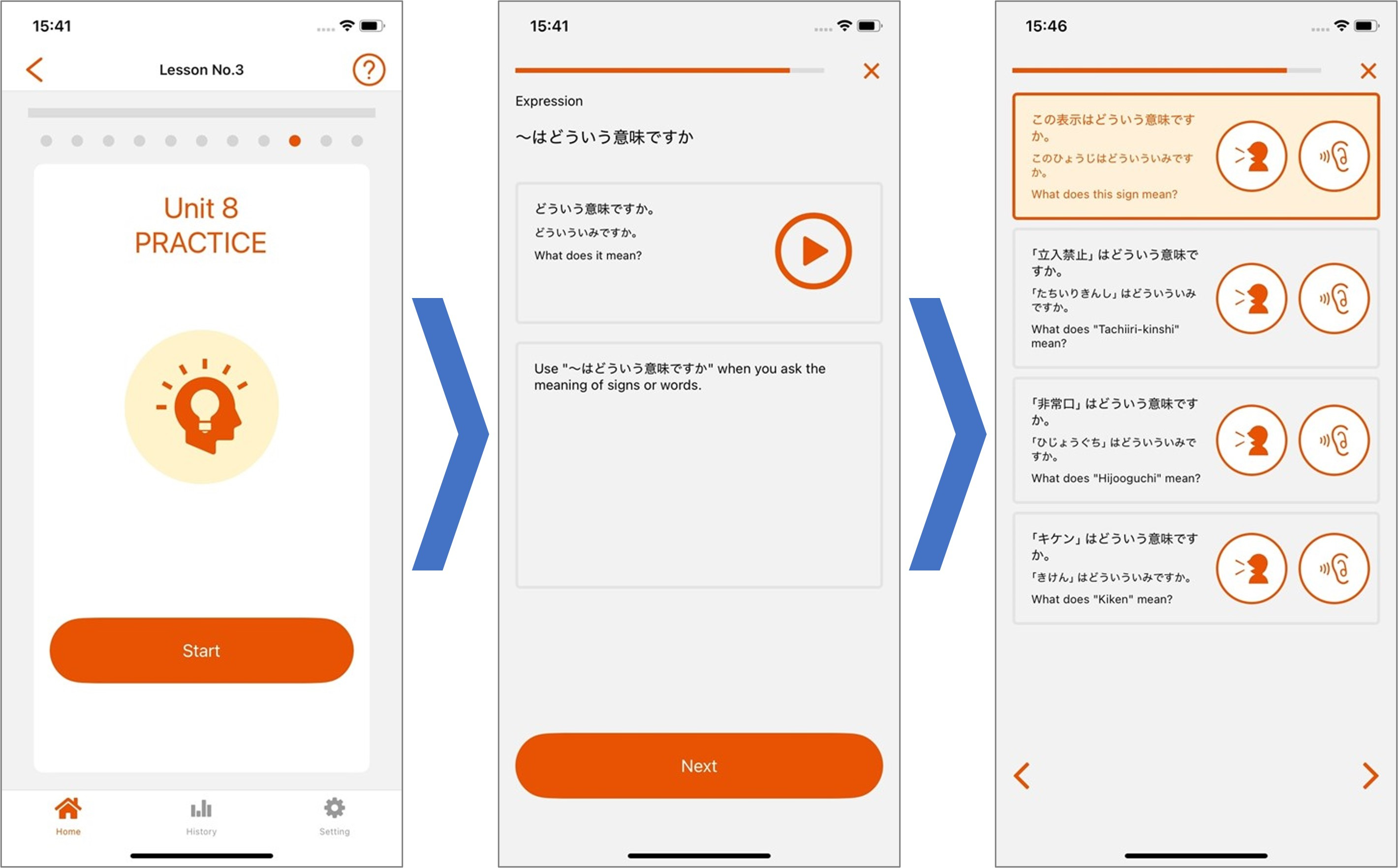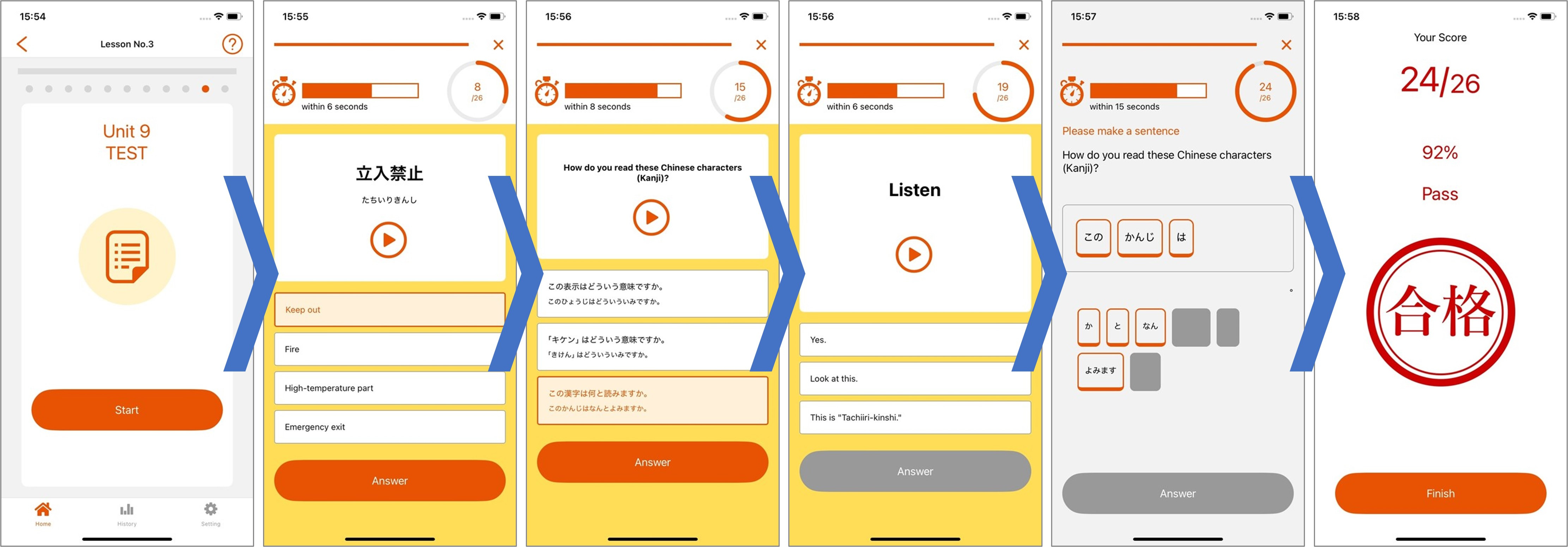 All of the lessons are different, but every lesson has units called CONVERSATION, WORD, SPEECH, PRACTICE, and TEST. The lessons are set so that you start with listening and understanding the conversations, and move on to being able to practice speaking.