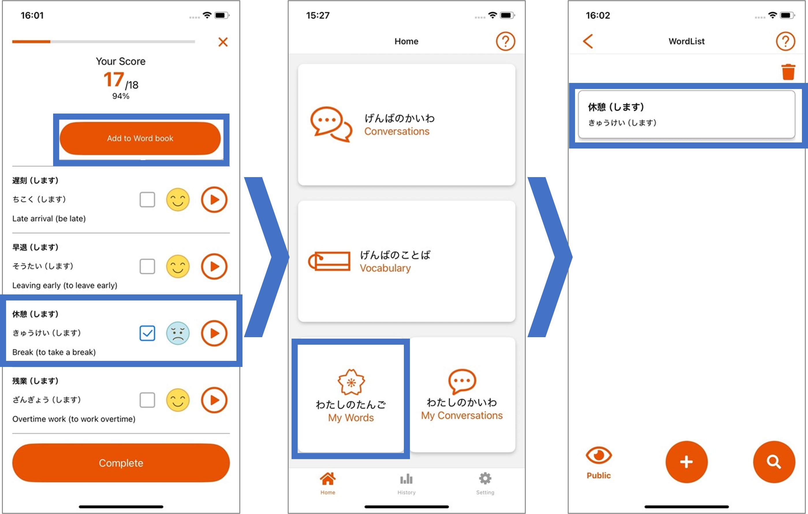 After you have answered all the questions, you can check your results. When you make mistakes or have difficulty memorizing words and phrases, add them to your list in My Words. This is very useful for reviewing!