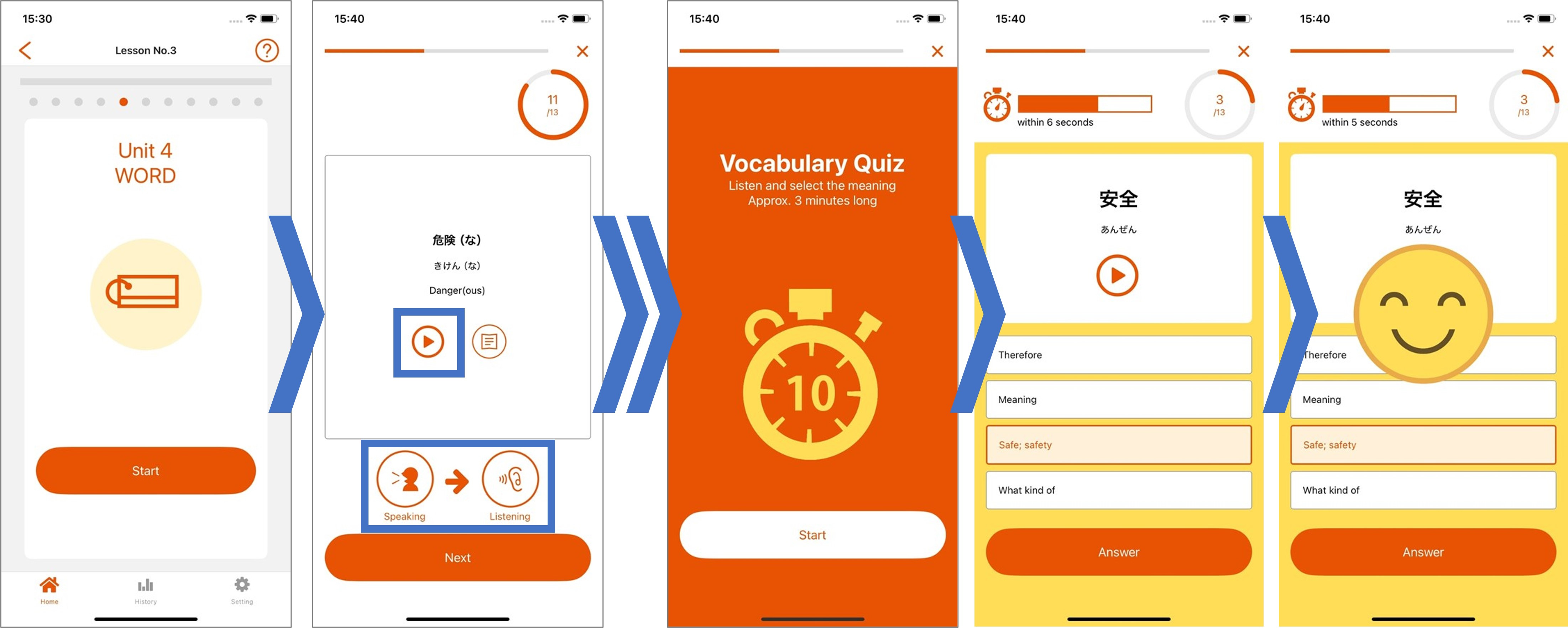 3. In WORD, you learn new words. Not only can you learn what the words mean, but you can also listen to how it is said and then record your own voice to check your pronunciation. After you study the words, there is a quiz at the end. You can take it as many times as you like, so keep repeating until you can easily get the meanings right!
