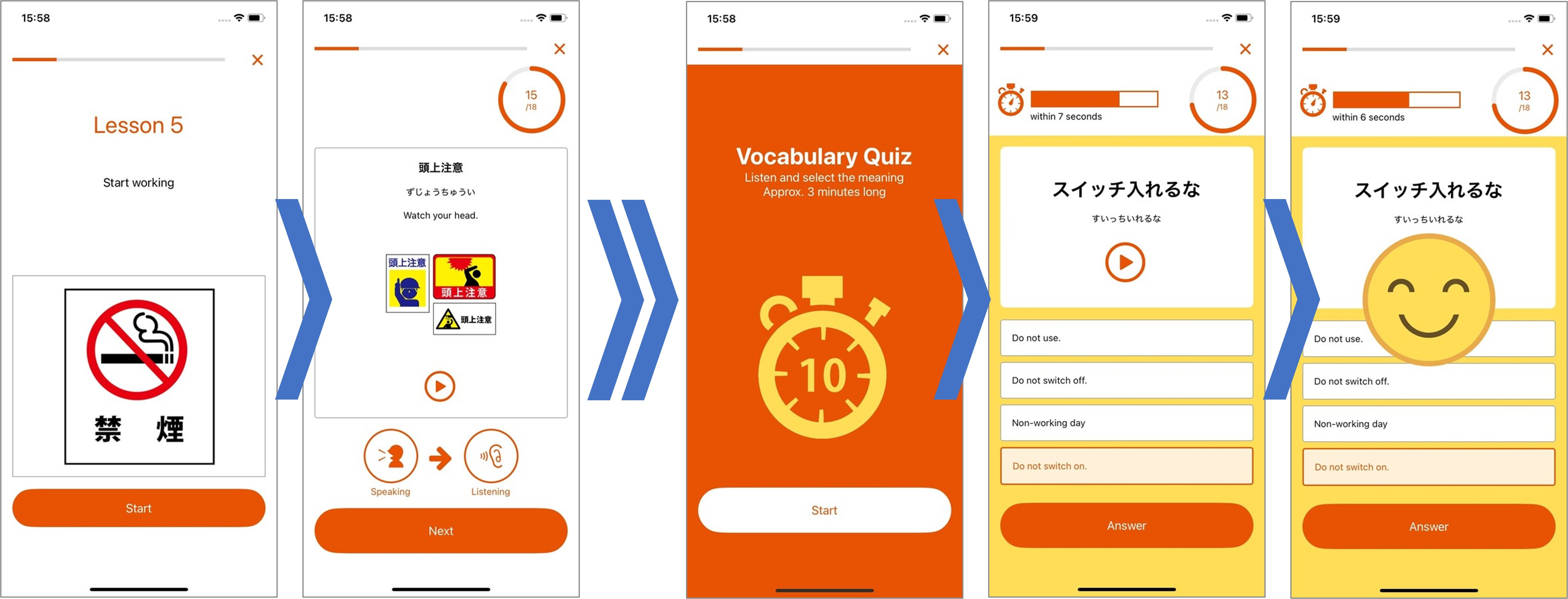 - 「げんばのかいわ」や「げんばのことば」では、仕事の現場で使用される会話を聞いたり話したりして、ことばや表現を学びます。会話の内容や学んだことばや表現を確認するためのクイズもあります。