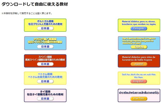 この算数の教材は、ポルトガル語版、タガログ語/英語版、スペイン語版があります。