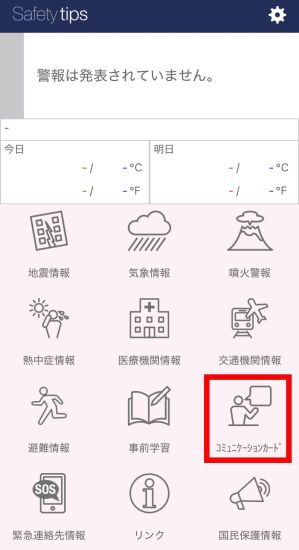 「コミュニケーションカード」で、災害のときに使うフレーズを知ることができます。