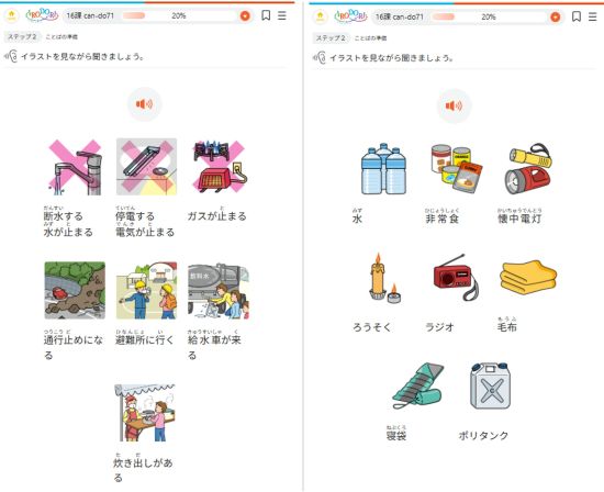 災害のときの会話を聞いて、大切なことばや文法を勉強することもできます。