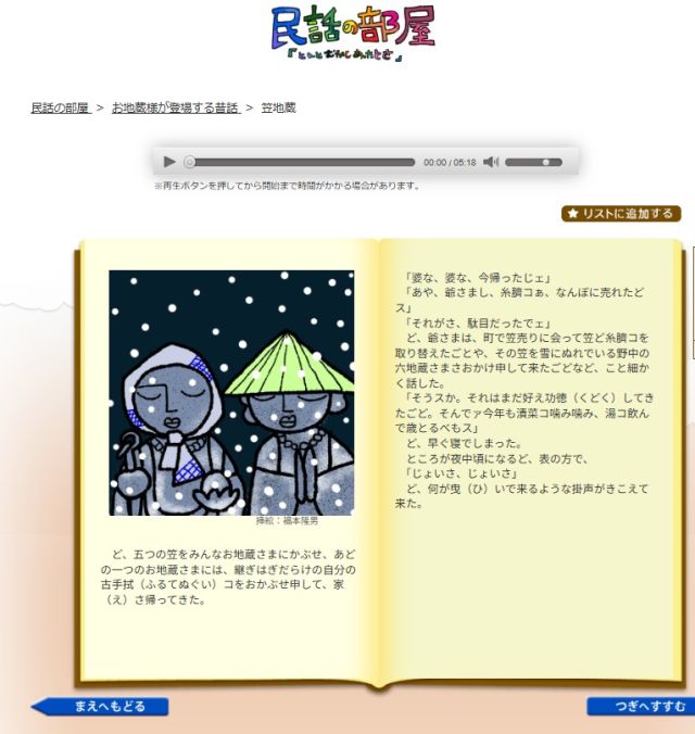「民話の部屋」は、日本各地に古くから伝わるいろいろな民話を、音声と文章で楽しむことができるサイトです。