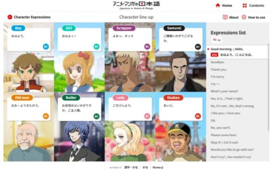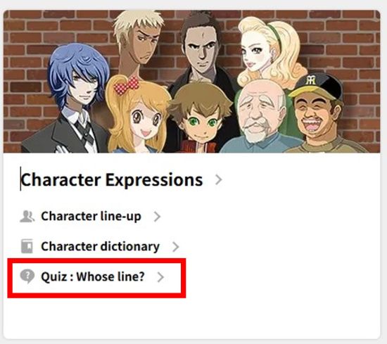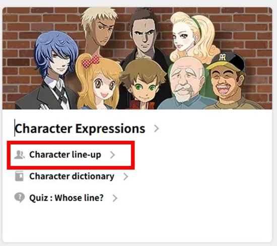 「Character Expressions」の「Character line-up」では、キャラクター毎に話される表現の違いが一斉に分かります。