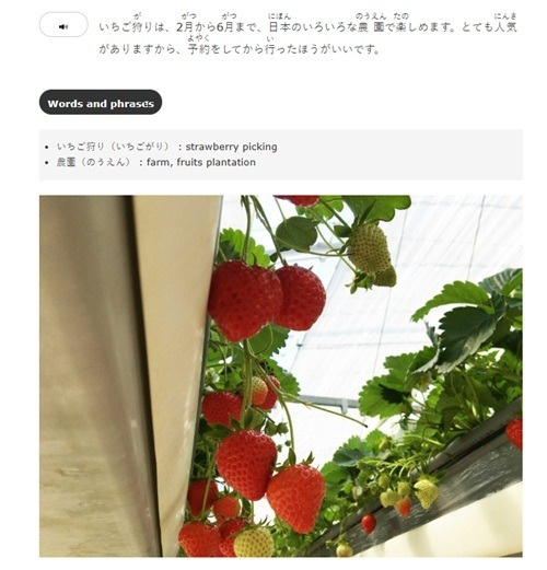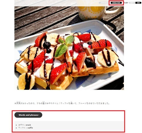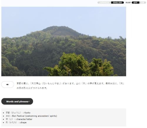 - 日本語と英語のページがあり、英語ページにはことばや漢字に訳があります。