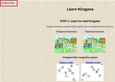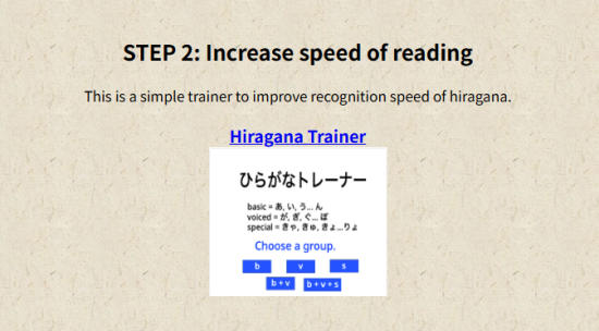 ステップ1(Learn to read hiragana)ではひらがなを覚えるためのプログラムが用意されています。